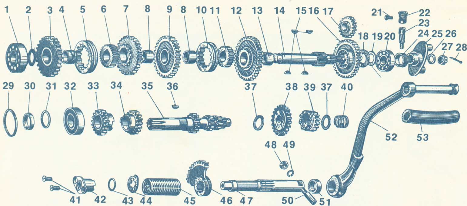 В картере коробки передач смонтирован специальный вал, на котором на бронзовой втулке вращается шестерня 2. Последняя через промежуточную шестерню находится в постоянном зацеплении с шестерней первичного вала.