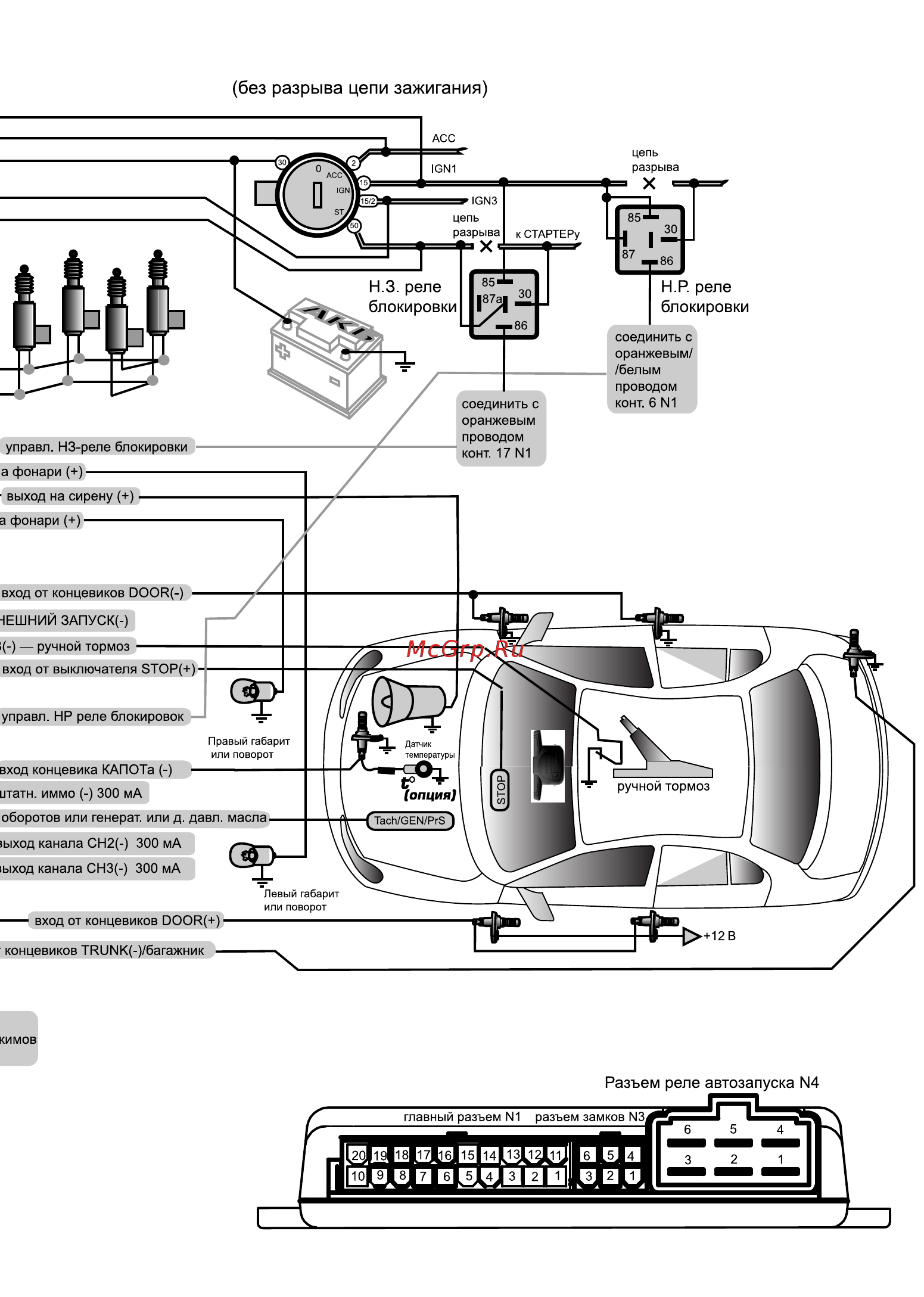 - Многоканальная программируемая функция Anti-Hi-Jack (дистанционное включение / прив ключении зажигания и срабатывании концевых выключателей DOOR(+) или DOOR(-) или начале движения автомобиля).