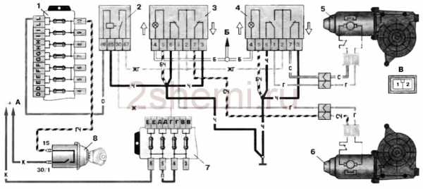 1 — основной блок предохранителей; 2 — реле включения электростеклоподъемников; 3 — переключатель стеклоподъемника левой двери; 4 — переключатель стеклоподъемника правой двери; 5 — моторедуктор электростеклоподъемника правой двери; 6 — моторедуктор электрического стеклоподъемника левой двери; 7 — дополнительный блок предохранителей; 8 — выключатель зажигания; А — к выводу «30» генератора; Б — к выключателю освещения приборов; В — условная нумерация штекеров в колодке моторедуктора.