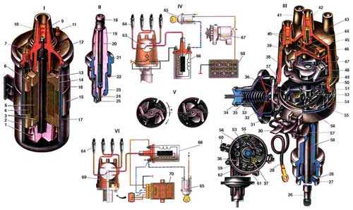 | 1 — свечи зажигания; 2 — распределитель зажигания; 3 — катушка зажигания; 4 — выключатель (замок) зажигания; 5 — генератор; 6 — аккумуляторная батарея |