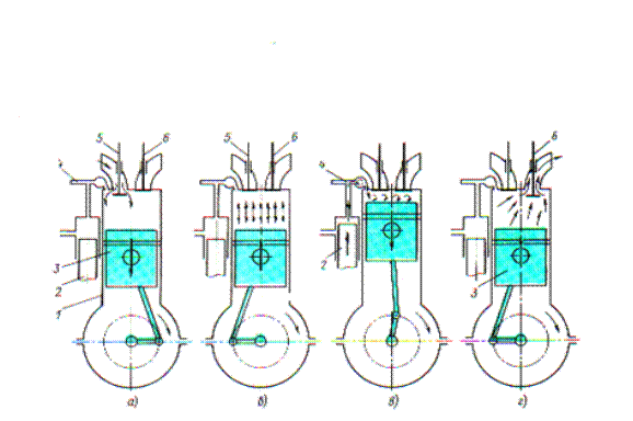 Через клапан \(1\) в цилиндр поступает горючая смесь, которая воспламеняется при помощи свечи \(6\), а через клапан \(2\) выпускаются отработавшие газы.