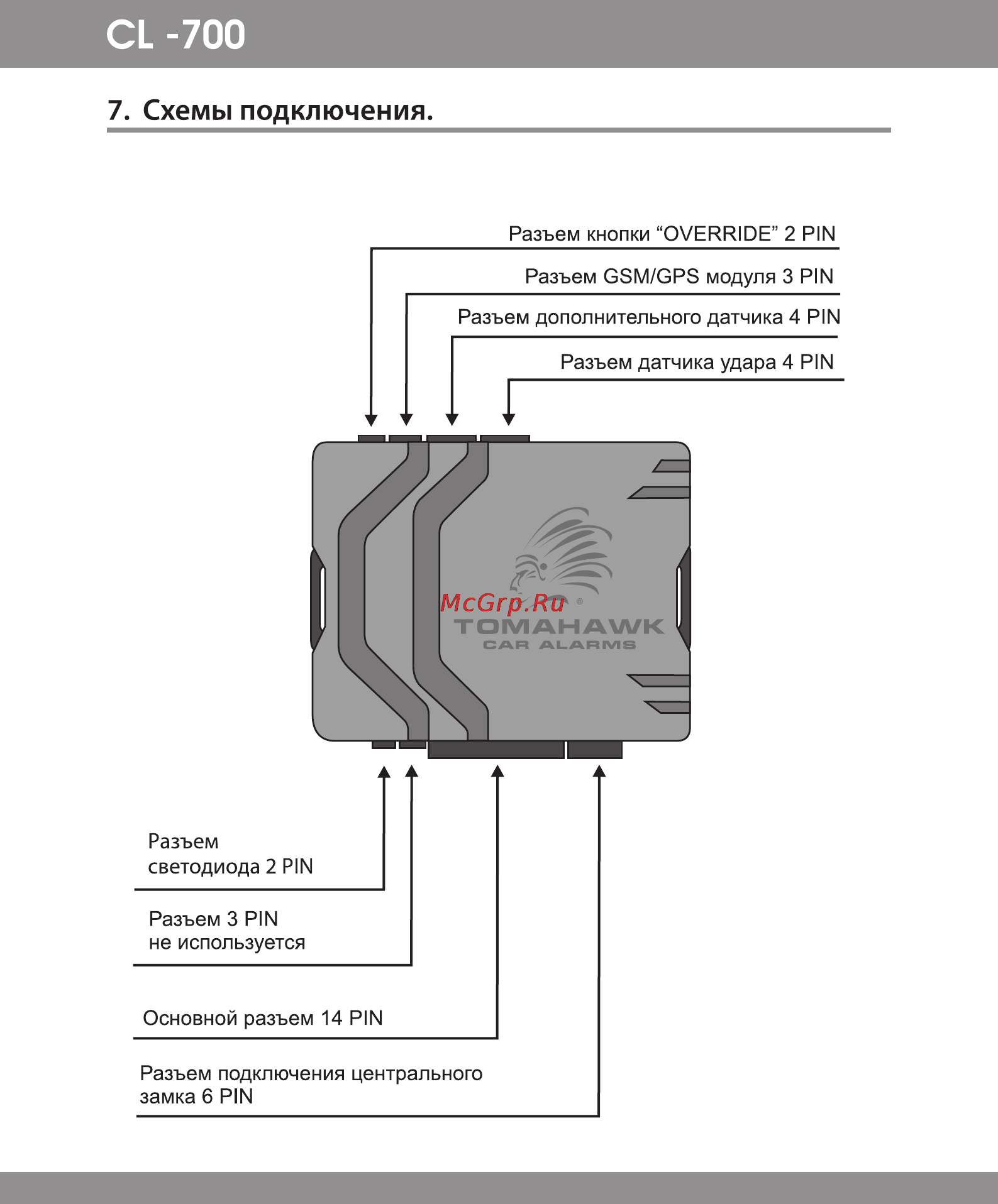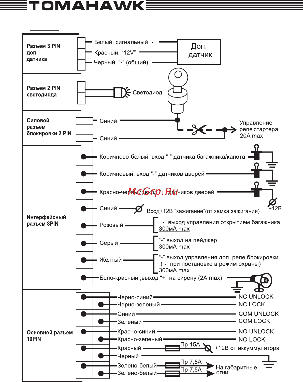5 P1.6 P1.7 P1.8 P1.4 P1.3 P1.2 P1.1 P1 P2 P3 P4 4 1 Белый / синий, блокировка COM Белый / коричневый, блокировка NO Зеленый, разблокировка NO Фиолетовый, разблокировка NC Желтый, разблокировка COM Черный / белый, выход заземления Белый / оранжевый, блокировка NC Красный / белый, выход +12 В Белый / зеленый, выход отключения стартера P3.4 Черный, заземление P3.3 Красный / черный, вход отключения стартера PA Красный, +12 В P3 .1 Серый / красный, световой выход 1 P4.7 Черный / серый, выключатель капота P4.6 Серый, дверной выключатель 1 P4.5 P5 P6 P7 P8 P8 P7 P6 P4.8 P4.9 Черный, сирена Черный, сирена P4. 10 Белый / коричневый, зажигание P4.11 P4.4 Белый, переключатель багажного отделения Белый / красный, дополнительное оборудование P4.12 Серый / белый, дверной выключатель