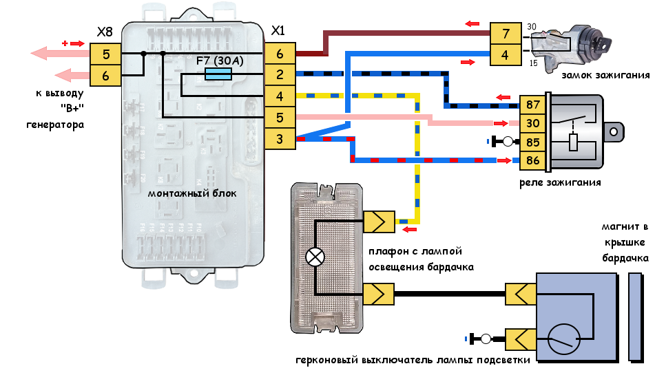 Контуры имеют диагональное распределение: заднее правое колесо работает совместно с передним левым, заднее левое – с передним правым колесом. При отказе одного из контуров такое решение позволяет сохранить устойчивость автомобиля при торможении, особенно на скользкой дороге и повороте.