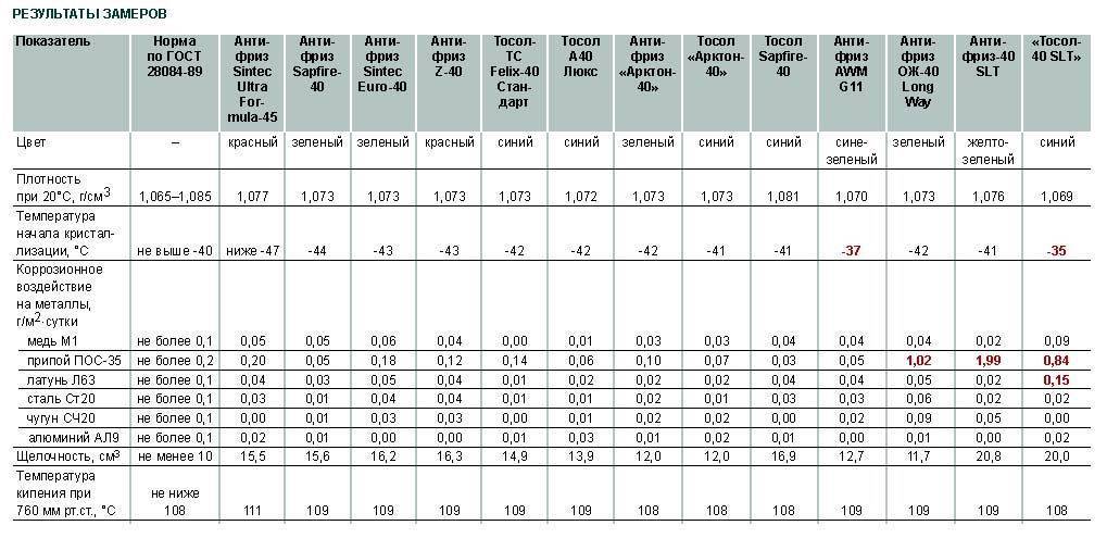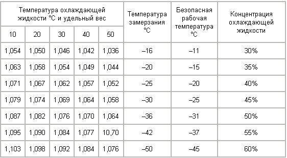 Каждому составу смеси соответствует определенная плотность. Значения плотности антифризов приведены в таблице 2.