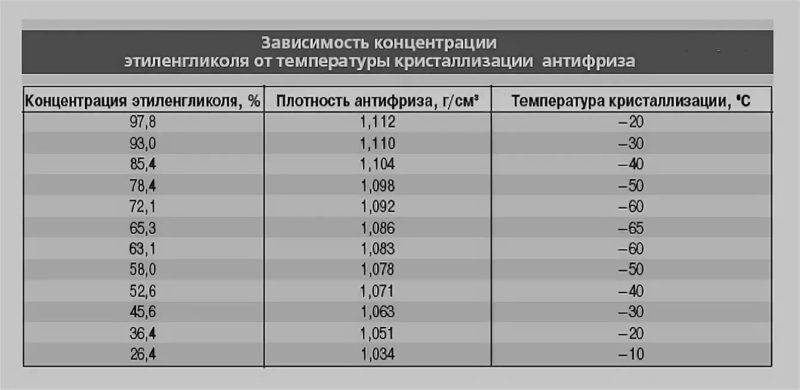 | Концентрация антифриза по этиленгликолю, % | Плотность антифриза, г/см3 при 20°С | Температура замерзания антифриза, °С |