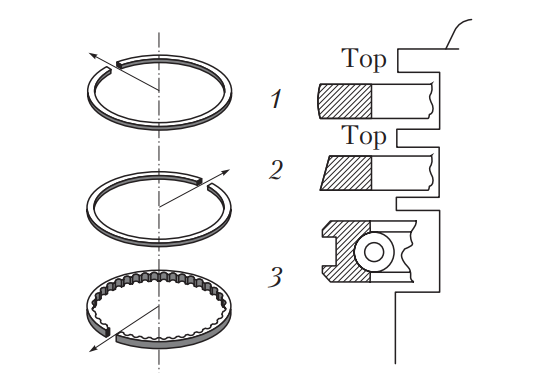 Для начала, давайте немного разберемся, что же из-себя представляет стандартный набор поршневых колец четырехтактного двигателя скутера. Стандартный комплект состоит из: двух компрессионных колец (верхнего и нижнего) и одного маслосъемного, которое в нашем случае имеет разборную конструкцию.