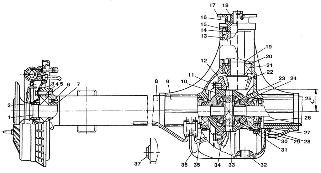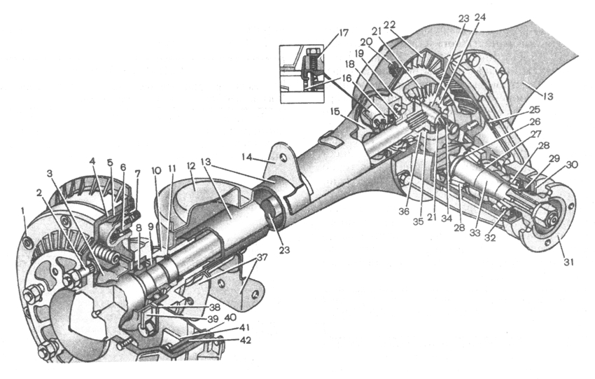 1 — фланец полуоси, 2 — болт крепления тормозного барабана и колеса, 3 — направляющий штифт, 4 — тормозной барабан, 5 — подшипник полуоси, 6 — сальник, 7 — кожух заднего моста, 8 — полуось, 9 — регулировочная гайка подшипника, 10 — сапун, 11 — сателит, 12 — ведомая шестерня главной передачи, 13 — шестерня полуоси, 14 — фланец ведущего вала, 15 — картер главной передачи, 16 — ведущая шестерня, 17 — ось сателитов, 18 — коробка дифференциала, 19 — стопорная пластина, 20 — крышка подшипника дифференциала, 21 — ролик подшипника, 22 — пластина фиксации подшипника полуоси.