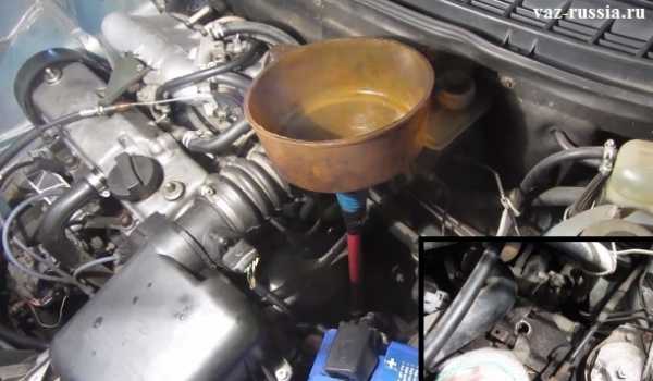 4) Следом в заливное отверстие из которого вы ещё выворачивали ранее щуп для проверки уровня масла, вставьте шланг и подсоединённую к этом шлангу воронку, таким образом как показано на фото чуть ниже:
