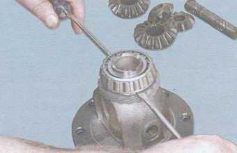 9. Осмотрите посадочные места подшипников на корпусе дифференциала. При значительной выработке этих мест замените корпус дифференциала. При наличии питтинга (раковин) на беговых дорожках и телах качения, следов вдавливания тел качения на беговых дорожках, повреждения сепараторов подшипники необходимо заменить.