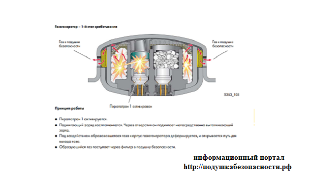 - Система получает сигнал от электронного блока управления и происходит срабатывание детонатора (заряда из таблеток натриевой кислоты), вследствие чего газ (аргон или озон) нагревается и под высоким давлением (до 250 мПа) вырывается наружу. Однако перед этим он проходит через специальный металлический фильтр и остужается.