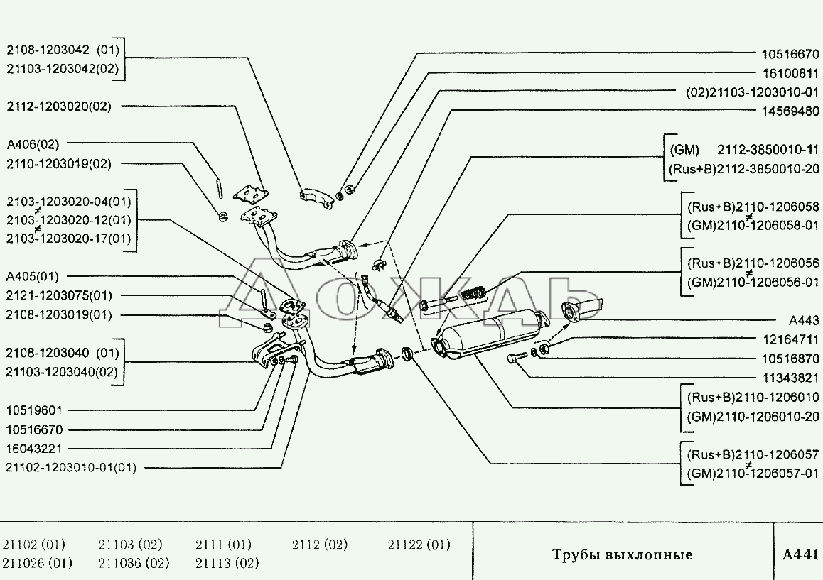 Выхлопная система для автомобиля ВАЗ 2110 состоит из следующих элементов: