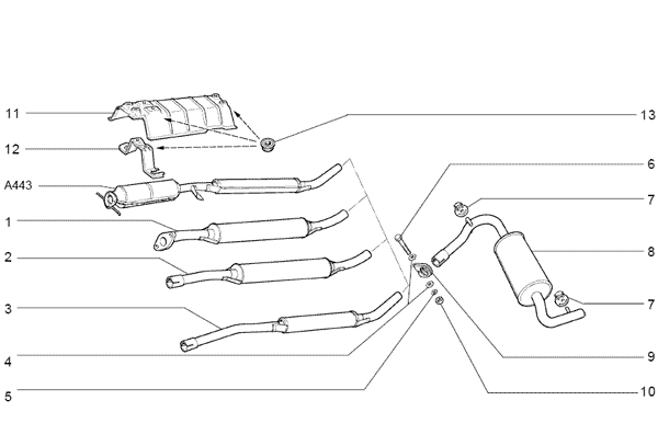 1 — уплотнительная прокладка; 2 — приемная труба; 3 — металлокомпенсатор; 4 — нейтрализатор отработавших газов; 5 — хомут крепления приемной трубы; 6 — уплотнительная прокладка; 7 — кронштейны подвески основного глушителя; 8 — основной глушитель; 9 — резиновые подушки подвески основного глушителя; 10 — хомут соединения трубы основного глушителя с трубой дополнительного глушителя; 11 — диагностический датчик концентрации кислорода; 12 — управляющий датчик концентрации кислорода; 13 — дополнительный глушитель
