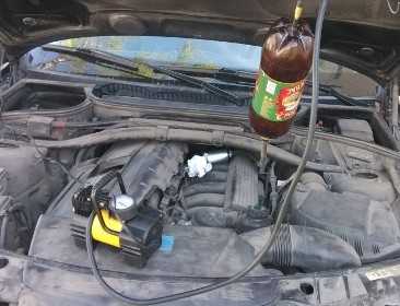 - Одноконтурная очистка с применением специальной мобильной установки (собирается из двухлитровой бутылки, автомобильных золотников, компрессора для накачки шин, бензостойкого шланга, хомутов). Подсоединяется к топливной рампе.