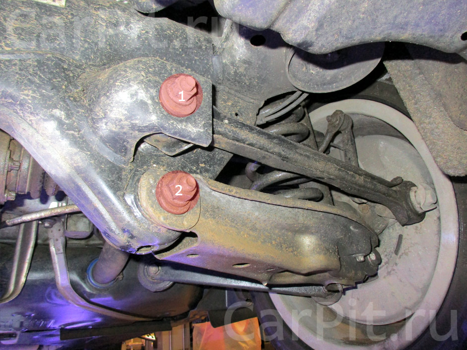 Сход на Тойоте Камри регулируется вращением муфты «1». Главное раскрутить две контргайки по бокам, для чего нередко их приходится греть автогеном.
