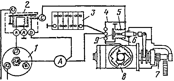замыкают ОВ генератора и контакт «ВЗ» реле-регулятора через нормально-замкнутые