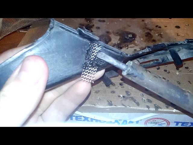 Ремонт с помощью впаивания металлической сетки.Место ремонта очищается от грязи. Если планируется впаивать сетку с лицевой стороны бампера, то обязательно счищаем в этом месте краску и грунт.