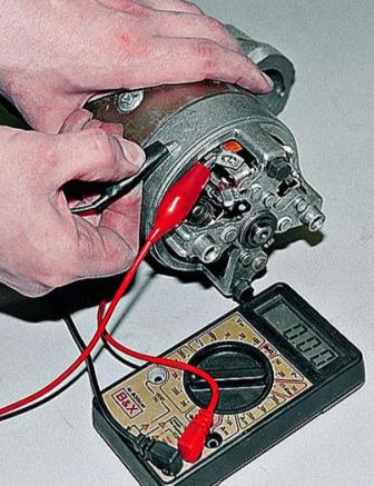 Для проведения дальнейшей проверки понадобится омметр. Снимите заднюю крышку стартера, чтобы добраться до щеточного узла. Вы увидите присоединенные к щеткам концы обмоток. Один щуп омметра поставьте на корпус детали, а вторым по очереди касайтесь контактов, присоединенных к щеткам. Показания прибора должны находиться в районе 10 кОм. Если это значение значительно меньше, значит, в обмотке статора есть межвитковое замыкание. Если же наоборот, стрелка омметра показывает «бесконечность», значит, есть обрыв. В любом случае придется покупать новый стартер.