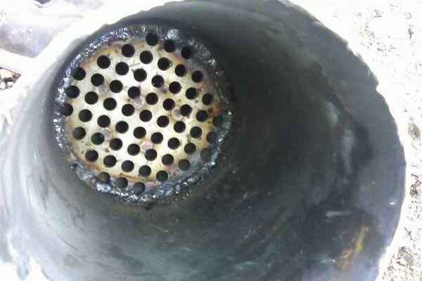 Большая труба должна быть на 30-40 мм больше в диаметре. После того, как по окружности малой трубы будут проделаны отверстия, ее необходимо зачистить щеткой по металлу и вставить в большую трубу (строго посредине). Большую трубу необходимо расположить с одинаковым отступом с каждой из сторон относительно меньшей, а затем следует сделать загибы надрезанных заранее частей и приварить их (швы также свариваются герметично).