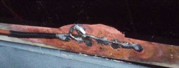 - Получившимся электродом, пропитанным в растворе, тщательно натираются участки оборванных нитей. Концы серьезных обрывов предварительно обрабатываются с помощью электропаяльника. Им же устанавливается связующая перемычка из тончайшего провода. В результате незначительно поврежденные участки затягиваются медью.