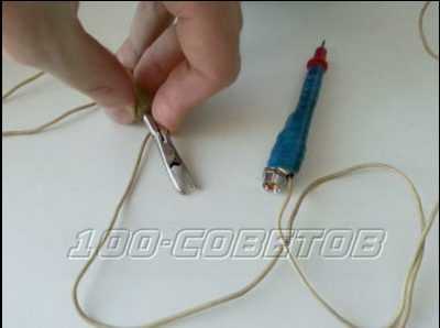 - Клеммы от устройства обогрева подключаются к массе. Провод от «плюсовой» клеммы аккумулятора соединяется с ранее изготовленной кисточкой из металлического прута.