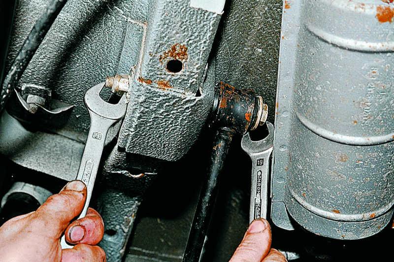 - Отрываем капот и при помощи ключа на «13» откручиваем крепление штока к кузову.
