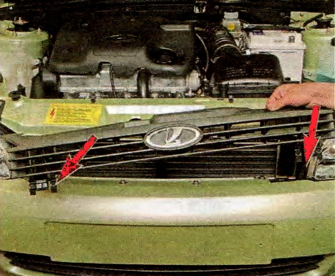 - Далее необходимо снять решетку радиатора, подробнее об этом написано здесь.