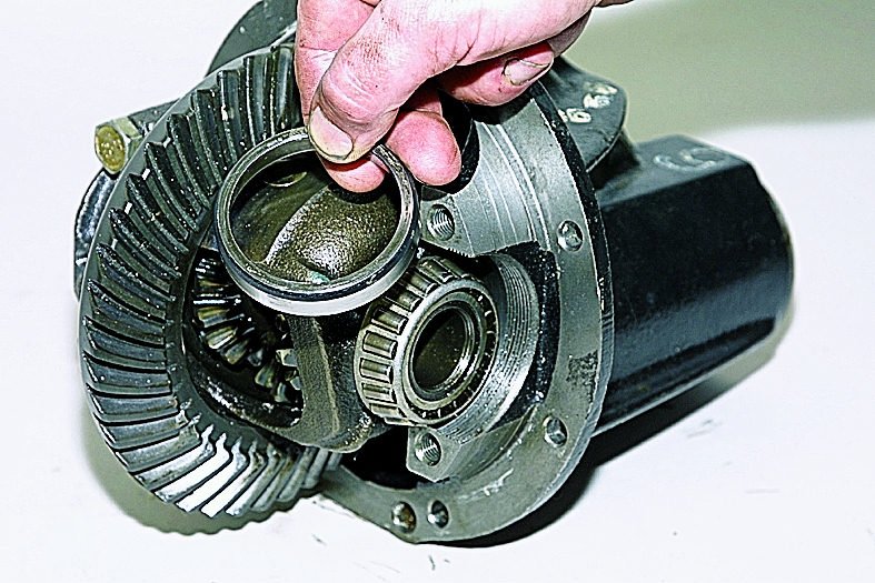 Сняв фланец, вынимается ведущая шестеренка с регулировочными кольцами, сальник, маслоотражатель, внутреннее кольцо подшипника. Затем выпрессовываем наружные кольца подшипников. В последнюю очередь разбирают ведущую шестерню и дифференциал. При полной разборке распорная втулка выбрасывается.