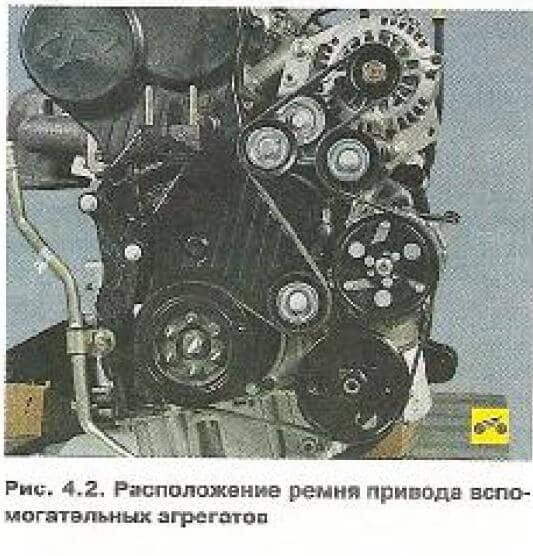 Шкивы привода вспомогательных агрегатов, генератора, компрессора кондиционера и насоса гидроусилителя руля шести ручьевые, а ремень привода — пятиручьевой.